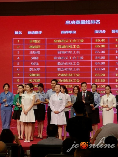 7月3日——5日,“中国梦•劳动美——学习贯彻习近平新时代中国特色社会主义思想和党的十九大精神”全省职工演讲比赛在太原举行,共有23支代表队,67名优秀选手参加,经过三场紧张预赛,我市代表队3名队员脱颖而出、挤入决赛。决赛中,我市选手晋煤集团总医院杨超君以《选择》为题的演讲,金鼎公司王盼盼以《一个“女焊子”的别样青春》为题的演讲,天泽煤化工集团股份公司周冰倩以《我是一个统计员》为题的演讲,都用真挚的情感表达了对职业的热爱与忠诚。演讲中,她们真实的感情流露一次次将演讲气氛推向高潮。最终,凭借真实感人的故事和优异的表现,杨超君荣获全省职工演讲比赛一等奖(全省第二名),王盼盼荣获比赛二等奖(全省第三名),周冰倩荣获比赛优秀奖;市总工会荣获团体比赛二等奖(全省第四名)。(供稿:市总工会)