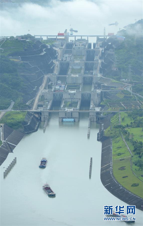 船舶有序通过三峡五级船闸(2017年10月4日摄)。截至2017年9月底,三峡船闸、葛洲坝船闸累计客货通过量双双突破1亿吨,有效发挥了三峡枢纽航运效益。 新华社发(郑家裕