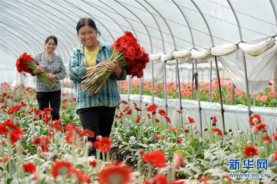 在江西省靖安县水口乡桃源村,当地农户在非洲菊种植基地采摘花卉准备外销(2017年4月20日摄)。坐拥整个鄱阳湖流域、正处工业化发展中期的江西,将为长江经济带生态文明建设寻找答案,给全国生态文明建设摸索标准,探索一条通向美丽中国的绿色崛起之路。 新华社记者