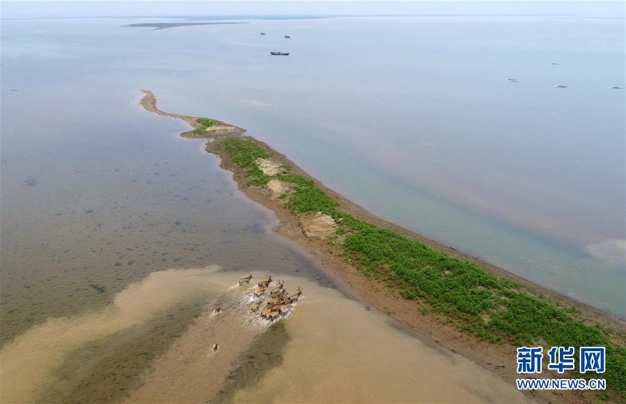 被野放的麋鹿在江西鄱阳湖湿地奔跑(4月3日无人机拍摄)。据国家林业和草原局统计,截至2018年7月8日,我国共有国际重要湿地57个、湿地自然保护区602个、国家湿地公园898个,湿地生态系统中有湿地植物4220种、动物2312种,湿地保护率达到49.03%。 新华社记者