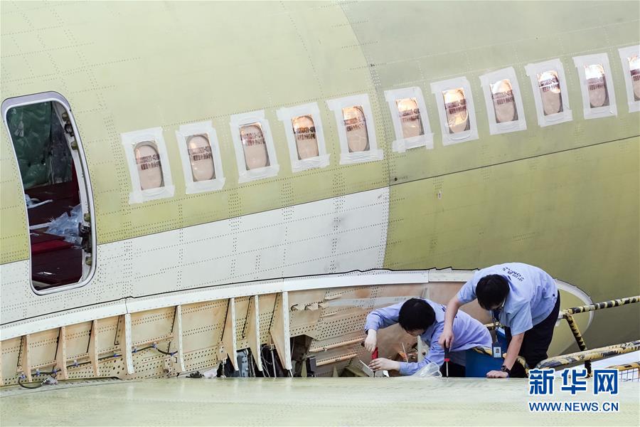 工人在中国商飞上海飞机制造有限公司的C919总装生产线进行装配(7月5日摄)。小到牙刷、电池,大到汽车、轮船、大飞机……改革开放40年,中国制造坚持开拓,苦练内功,在与世界贸易伙伴携手共进中,逐渐融入全球贸易体系。新华社记者